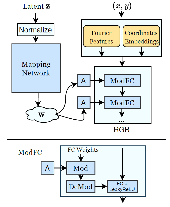 이미지 생성 시, 랜덤 벡터 z는 모든 픽셀에서 공유하며 (x, y)가 픽셀 좌표에 따라 변화하며 입력되어 전체 이미지를 만들어낸다.