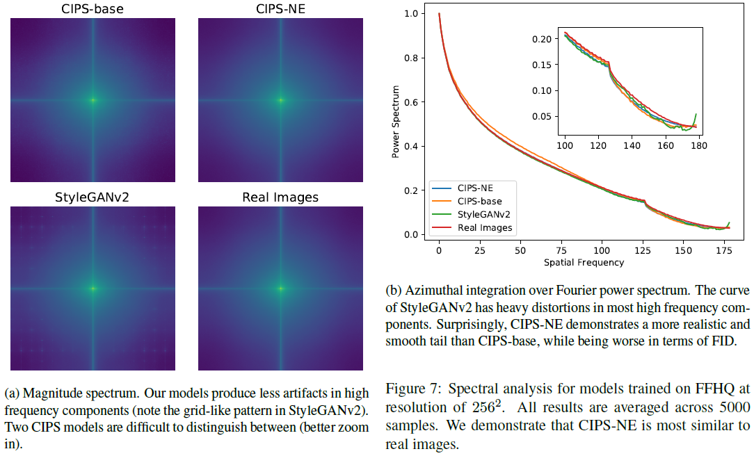 그래서 Spectral을 Convolutional Upsampling을 사용하는 StyleGAN2와 비교하였는데, StyleGAN2의 Magnitude Spectrum을 보면 고주파 영역에 점이 좌표 칸처럼 찍혀있는 것을 볼 수 있지만 CIPS는 깔끔하다.