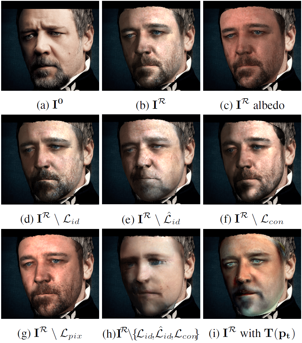 여기서 $I^0$는 입력 이미지, $I^R$는 rendering 결과물, $F^n$은 ArcFace 모델의 끝단 feature를 의미한다.