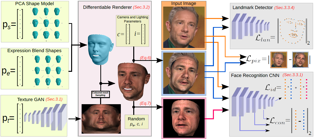 이후 단계에서는 먼저 학습한 Texture GAN 출력을 PCA shape model의 결과물에 입혀 입력 이미지와의 오차가 적은 parameter를 추정한다.