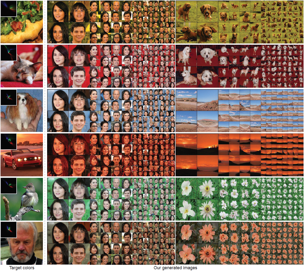 GAN을 통해 이미지를 생성할 때 색상을 조절하는 것은 상당히 까다로운 문제인데, 이 문제를 Color Histogram을 입력으로 받아 Histogram에 맞는 이미지를 생성하는 모델을 제안한다.