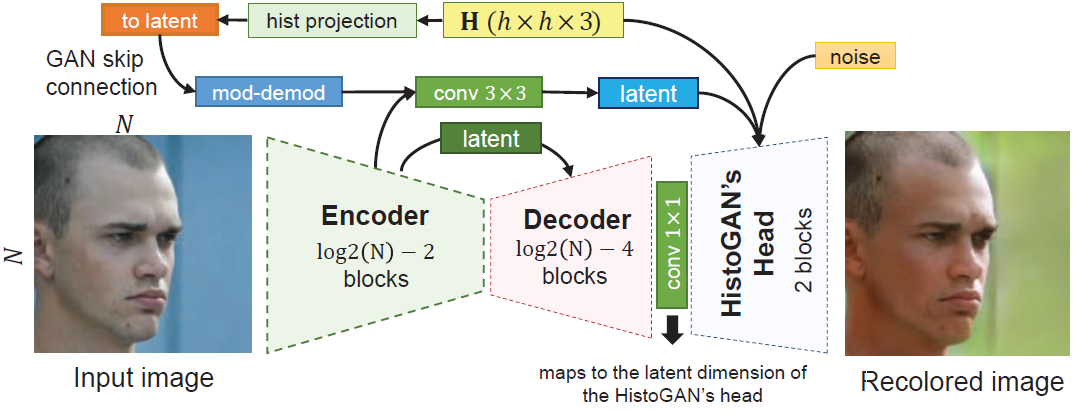 또 입력 이미지 외에 target histogram은 어디로 입력하나 싶은데 Figure 4에서 맨 위의 $H(h \times h \times 3)$가 target histogram이며 이로부터 U-Net 출력과는 별도의 latent를 만들어 HistoGAN head의 convolution weight를 mod-demod 한다. 이 부분은 HistoGAN에서 설명한 것과 동일하게 반영되는 것이다.
